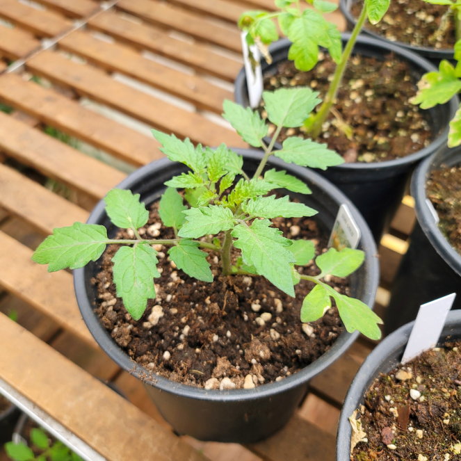 As the tomatoes were potted up from 4″ pots to 1 gallon pots the shelves start filling up in the greenhouse.