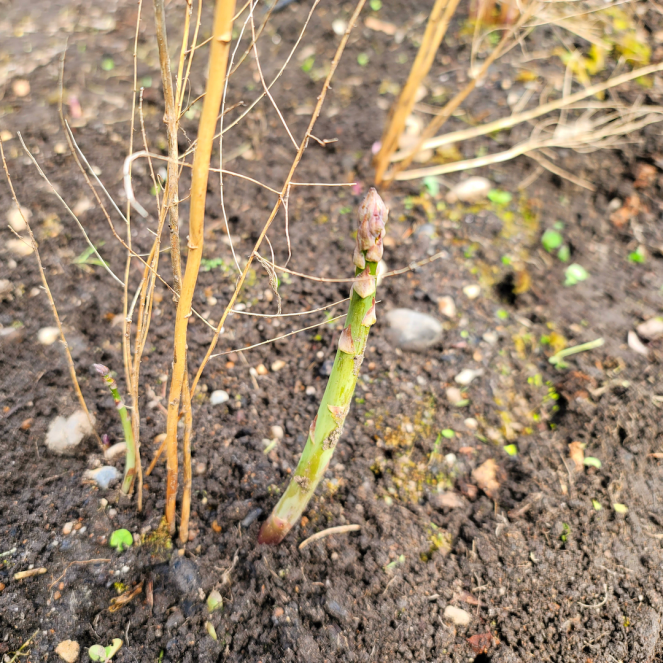 First of the asparagus coming up for spring. This is the year we can start harvesting.